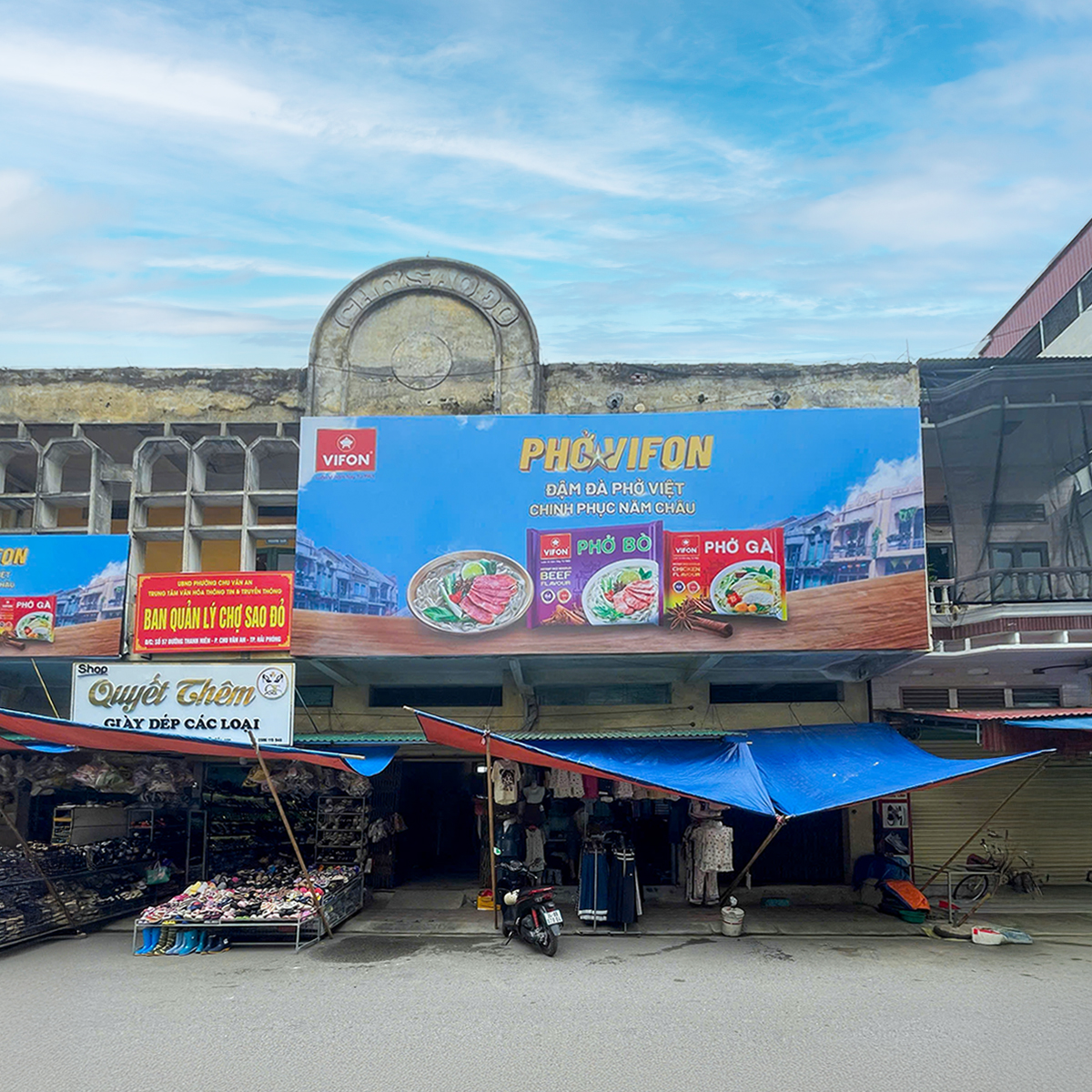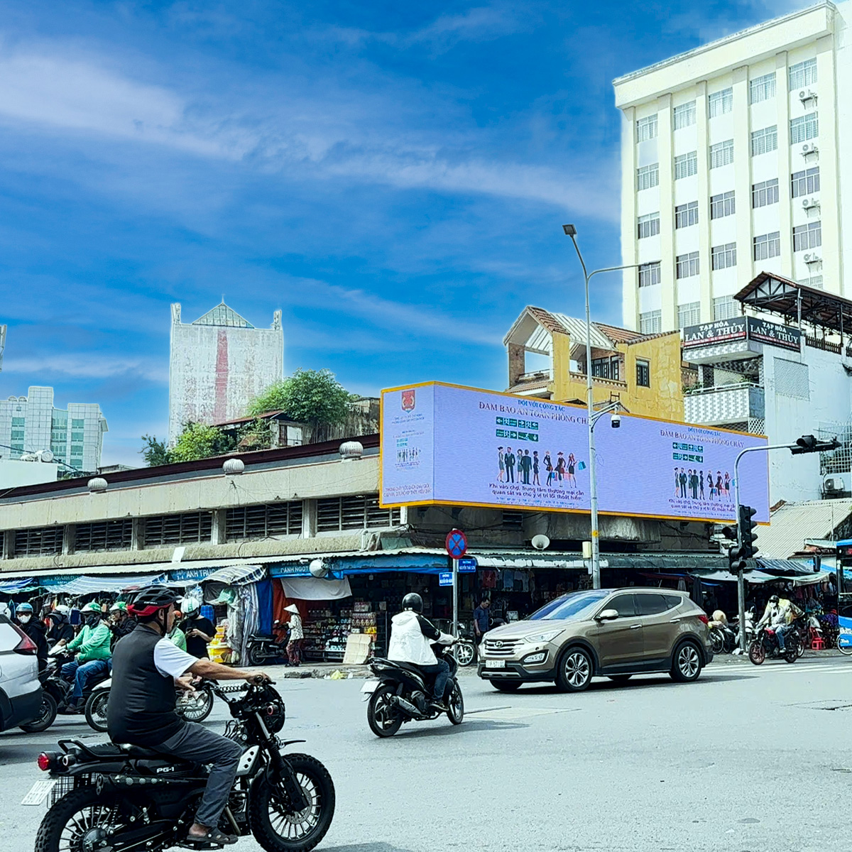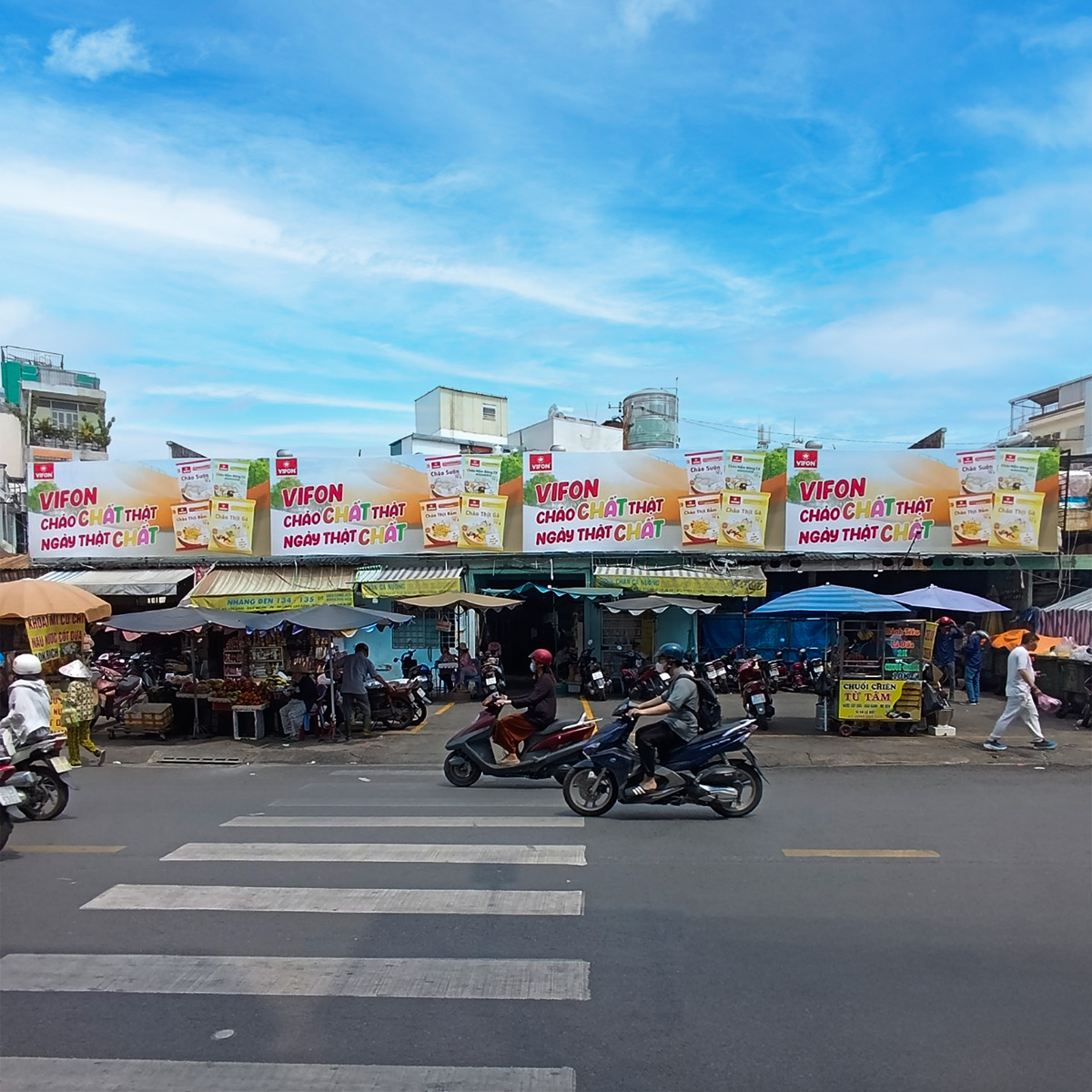 Quảng cáo pano tại các chợ truyền thống – điểm tập trung đông người mua sắm mỗi ngày, đặc biệt là nhóm nội trợ và tiểu thương. Vị trí hiển thị lâu dài, tần suất tiếp xúc cao, giúp thông điệp chiến dịch phủ rộng và ghi nhớ sâu tại khu vực dân cư.